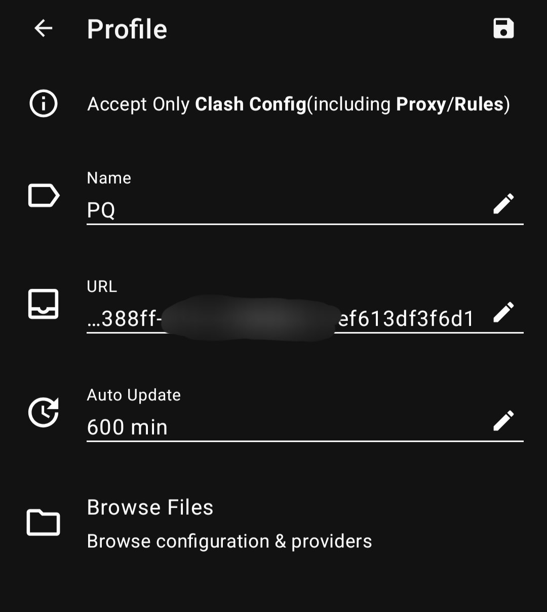 You can enter any profile name. In the URL field, paste the link to your subscription in clash format. In the automatic subscription update field, you can enter 600 minutes.