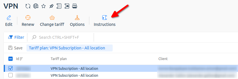 The subscription link is available in the email and is accessible from your client area. In your client area, select VPN service and click the