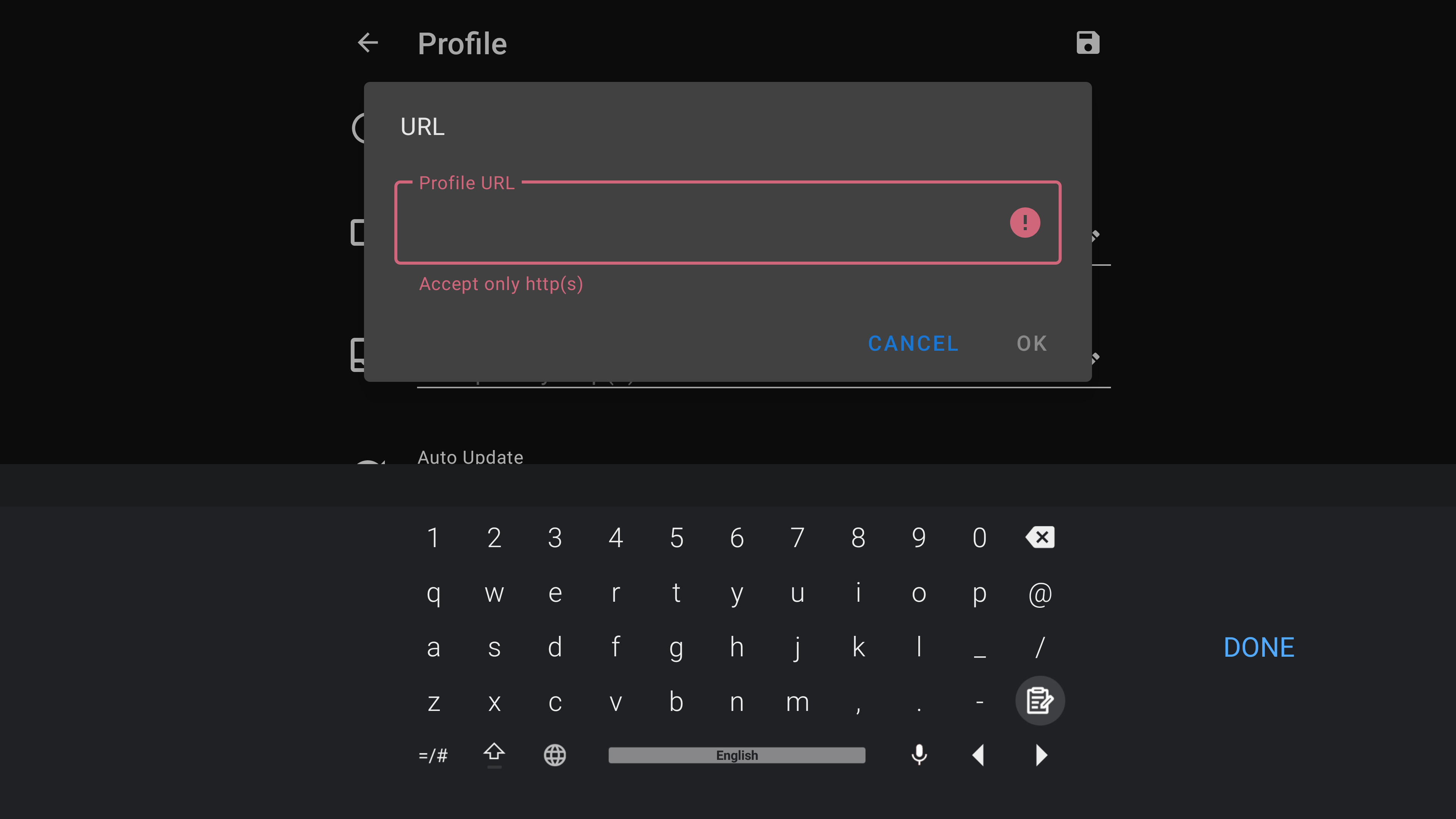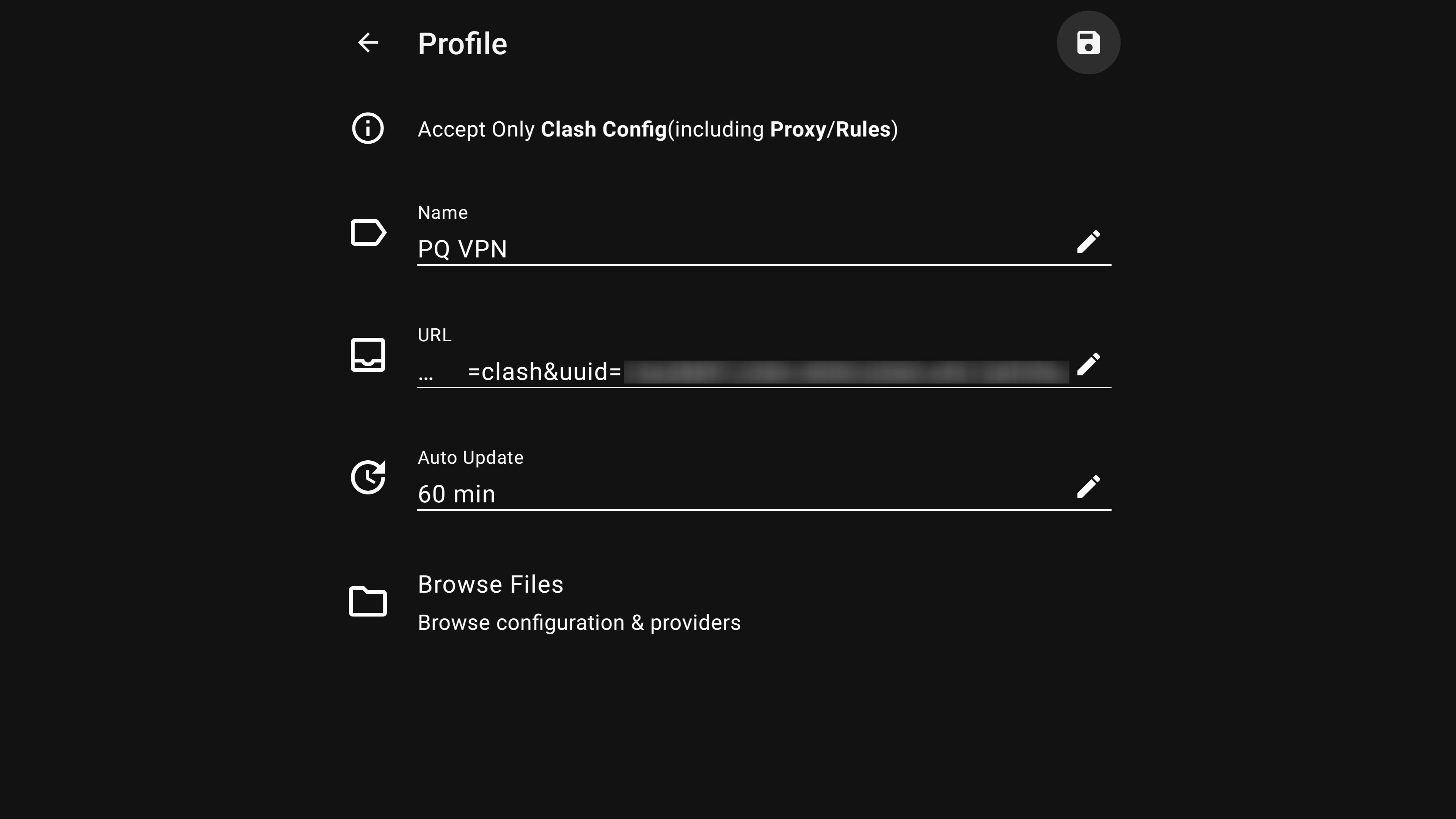 You can enter any profile name. In the URL field, paste the link to your subscription in clash format. In the automatic subscription update field, you can enter 60 minutes.